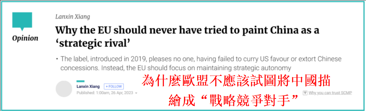 香港《南華早報》報道截圖 文章稱,法國總統馬克龍最近的訪華之行暴露了歐盟對華戰略“近退兩難”的困境。歐盟委員會主席馮德萊恩於2019年上任時宣稱,她要將歐盟委員會打造成一個“地緣政治委員會”以追求“戰略自主”,暗示了歐盟希望奉行獨立於美國的外交政策。 但是,在2019年初,歐盟外交政策官員發佈了一份對華戰略文件《歐盟—中國:戰略展望》。該文件將中國認定為“制度性對手”,并將中國作為歐盟合作夥伴和競爭對手的概念相併列。由此可見,歐盟對華戰略存在顯而易見的內在矛盾。 歐盟一直未能清楚地解釋“制度性對手”的含義。如果給中國貼上這個“標籤”是為了取悅美國并強調意識形態上的友情,那麼歐盟就錯了。時任美國總統特朗普似乎對意識形態不感興趣,而且他也并不喜歡歐盟。如果該標籤是為了和中國討價還價來換取一些利益,那麼歐盟又錯了,因為中國厭惡意識形態鬥爭。 從理論上講,“制度性對手”的戰略應該可以在拜登的政府中找到更好的歸宿,因為拜登似乎沉迷於“冷戰集團政治”。