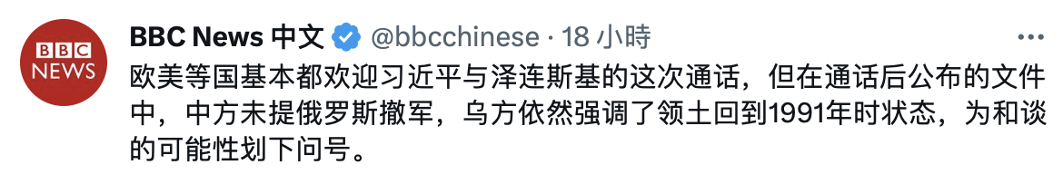 中烏進行通話後,唯恐天下不亂的英媒BBC跳出來帶節奏了。BBC在報道中稱,歐美等國基本都歡迎習近平與澤連斯基的這次通話,隨後話鋒一轉說,“但在通話後公布的文件中,中方未提俄羅斯撤軍,烏方依然強調了領土回到1991年時狀態,為和談的可能性划下問號。”