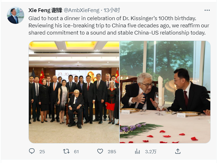 中國駐美大使謝鋒發推曬合影 慶祝基辛格百歲壽辰分享到: