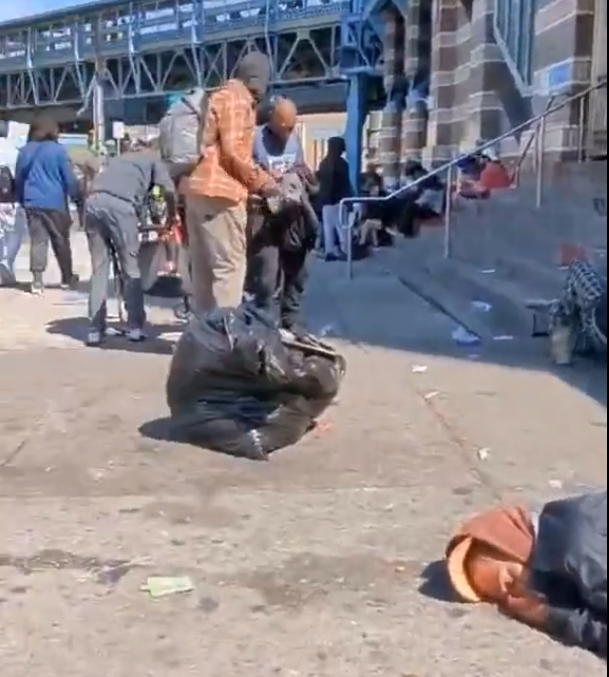 美國費城街頭畫面 視頻截圖 畫面顯示,在費城肯辛頓社區,成群的癮君子如同電影中的僵屍一般,漫無目的地彎腰前行,街頭遍佈帳篷,垃圾散落一地。許多癮君子光天化日之下注射毒品,還有不少吸毒者昏倒在地上。