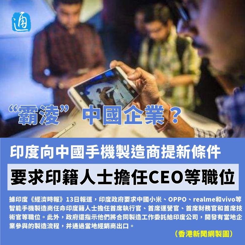 印度向中國手機製造商提新條件,要求印籍人士擔任CEO等職位香港新聞網6月14日電 印度媒體最新報道稱,印度政府對在印度的中國智能手機製造商提出了多項新要求,公司的首席執行官、首席財務官、首席運營官、首席技術官要由印度籍人士擔任。在此之前,印度執法局扣押小米50億元資金的事情已經引發國際媒體持續關注。 《環球時報》報道,13日,一位熟悉中企在印度情況的人士表示,印度政府的這種行為是“霸淩”,等於“變相收購中國企業”。另一位人士提到,印度政府之前對中企也有類似要求。印度政府對發展經濟和產業、推動“印度製造”可謂雄心勃勃,但多年來一些針對外資的政策和做法備受詬病,如果給外界留下營商環境惡劣的印象,新德里顯然將蒙受損失。