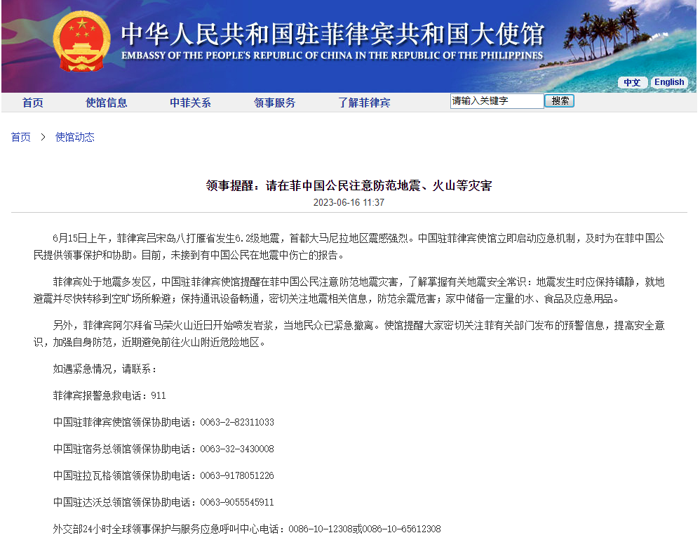 香港中通社6月16日電 據中國駐菲律賓大使館網站消息,6月15日上午,菲律賓呂宋島八打雁省發生6.2級地震,首都大馬尼拉地區震感強烈。中國駐菲律賓使館立即啟動應急機制,及時為在菲中國公民提供領事保護和協助。目前,未接到有中國公民在地震中傷亡的報告。