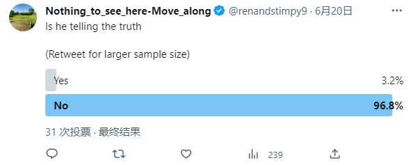 更有網友在留言區發起了一個小調查“他(拜登)說的是真的嗎?”,雖然只有31人投票,但其中96.8%選擇了“不是”。