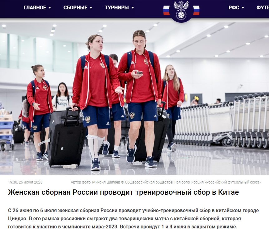 俄羅斯足球協會官網發佈的消息截圖 據環球網引述俄羅斯衛星通訊社6月27日報道稱,俄羅斯女足周一(6月26日)晚乘坐直飛航班,從謝列梅捷沃機場出發前往中國,將在青島進行集訓直到7月6日。球隊已到達集訓地,計劃6月27日進行首次場地訓練。報道還稱,俄主教練尤里•克拉斯諾詹共率領23名球員參加集訓,球隊將於7月1日和4日與中國隊進行比賽,兩場比賽都將空場進行。 據俄羅斯衛星通訊社報道,克拉斯諾詹說,“今年6月,我們收到了中國隊的邀請,將舉辦兩場友誼賽。與如此高水平的對手比賽非常有趣。中國女足隊多次獲得亞洲杯冠軍,是世界杯和奧運會的獎牌得主。現在中國隊正在備戰2023年女足世界杯,因此比賽將空場進行”。他還稱,俄羅斯有兩個任務,即考慮到俄被禁止參加一些比賽,讓國家隊為未來做好準備,同時,集結當前所有最有能力的人,無論前景如何。“很高興我們能够集結到俄羅斯幾乎所有的頂尖球員。(俄女子足球)超級聯賽已經進行了14輪,各支球隊都在比賽,球員們必須保持良好的狀態。”克拉斯諾詹稱。 據塔斯社此前報道,在俄烏衝突爆發後,2022年2月28日,國際奧委會向國際單項體育聯合會發出建議,禁止俄羅斯和白俄羅斯的運動員參加國際比賽。2023年3月,國際奧委會建議國際單項體育聯合會允許不支持特別軍事行動的俄羅斯人以中立運動員的身份參賽,同時提議不允許與武裝部隊或安全機構有關聯的運動員參加比賽。 【編輯:梅婉潼】