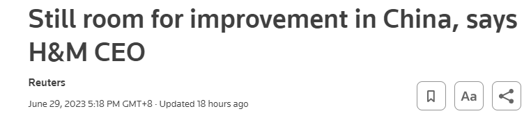 路透社報道截圖 據路透社報道,赫爾默森29日談及中國市場時稱:“總的來說,我們看到它(H&M)朝著正確的方向發展,儘管還沒達到我們想要的水平。” “我們的確看到,我們對產品的專注以及將客戶體驗本土化,(這些努力)正得到回報。”赫爾默森補充道。 報道稱,H&M集團如今不再提供具體國家的銷售數據,因此難以追蹤其在中國的表現。 據《中國基金報》報道,第三方監測數據顯示,H&M在中國的門店從2020年的479家減少至2022年的360家。兩年間,H&M的中國門店減少了100多家。 H&M於1947年在瑞典成立,主要銷售服裝和化妝品,2007年正式進入中國市場。2021年3月,H&M跟風西方炒作涉疆議題,在官網上發聲明抵制新疆棉花,引起中國消費者的強烈不滿:“一邊污衊中國,一邊又想賺中國人的錢?痴心妄想!”(編譯:李雪萍) 【編輯:李雪萍】