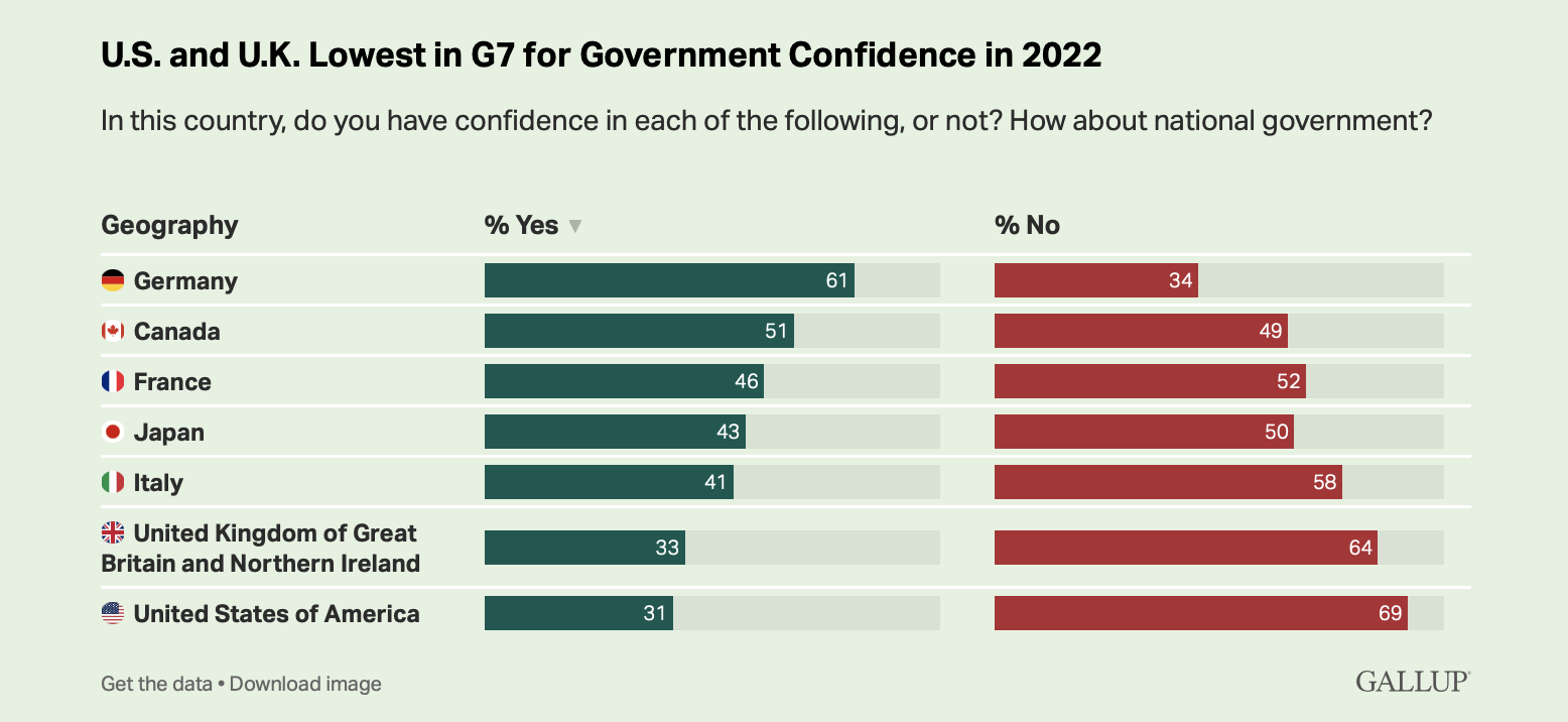 香港新聞網7月4日電 據美國《國會山報》當地時間7月3日報道,根據蓋洛普最新發佈的一項針對七國集團政府信心指數的民意調查顯示,美國和英國獲得的信心指數最低。