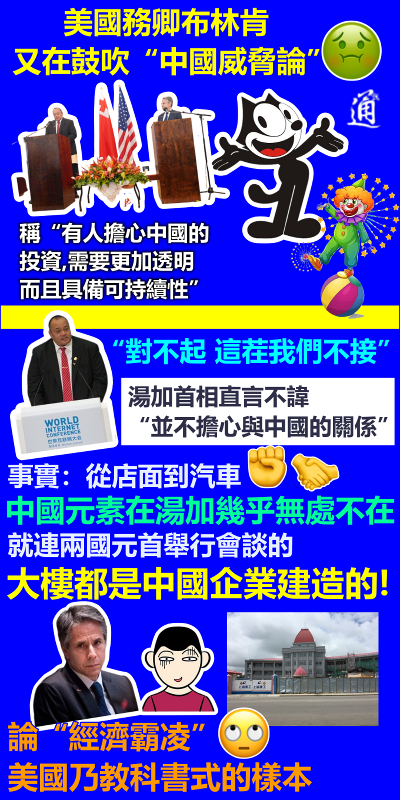 布林肯聲稱,隨著中國在(印太)地區的參與度不斷提高,美國認為中國的“一些行為越來越存在問題......比如南海軍事化及掠奪性融資”,“有人擔心中國的投資需要更加透明而且具備可持續性”。 可令人尷尬的是,面對布林肯從旁鼓吹中國威脅,湯加首相卻直言不諱“並不擔心與中國的關係”。值得注意的是,從店面到汽車,中國元素在湯加幾乎無處不在,就連兩國元首舉行會談的大樓都是中國企業建造的。 美國鼓吹“中國威脅論”,豈料被狠狠打臉! 【編輯:汪彥希】