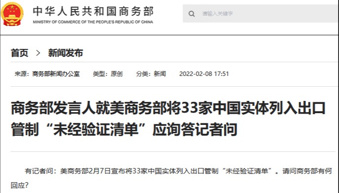 香港新聞網8月22日電 當時時間21日,美國商務部在一份聲明中宣布,工業和安全局將33個實體從“未經驗證清單”(Unverified List)剔除,其中27個實體位於中國,包括北京普科測控技術有限公司、廣東光華科技股份有限公司、蘇州超微精納光電有限公司等。這一決定於21日對外公開展示,并於今日(22日)在《聯邦公報》上公佈後生效。