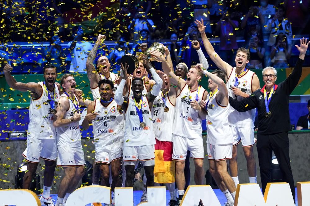 9月10日,德國隊在頒獎儀式上慶祝奪冠。圖自新華社 德國隊上一次進入男籃世錦賽半決賽要追溯到2002年。本屆男籃世界盃決賽開始,兩支勢均力敵的球隊展開激烈拼搶,首節塞爾維亞隊以26:23領先。第二節,比賽繼續呈膠著之勢,至上半場結束,兩隊以47:47戰平。 下半場開始,多位主力缺陣的塞爾維亞隊狀態下降,德國隊趁勢拉開比分,在以69:57結束第三節後,最終以83:77獲得勝利,歷史性奪冠。 決賽中,被稱為“黑色閃電”的施羅德一人獨得28分、3個籃板和1次助攻。正是在他的強勢發揮之下,德國男籃本屆世界盃取得八戰全勝完美戰績。施羅德最終成為本屆世界盃MVP。當選決賽MVP的德國前鋒弗朗茨·瓦格納決賽中得到19分,貢獻了7個籃板、2次助攻、3次搶斷. 此前,德國隊在半決賽戰勝美國隊。而在10日進行的季軍爭奪戰中,世界盃五冠王美國隊經過加時賽,以118:127不敵加拿大隊,位居第4名,連續2屆世界盃無緣獎牌。 通過本屆世界盃,德國隊、塞爾維亞隊、加拿大隊、美國隊、日本隊、南蘇丹隊和澳大利亞隊獲得巴黎奧運入場券。(完) 【編輯:梅婉潼】