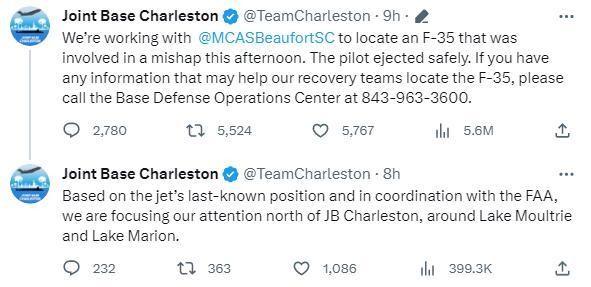 查爾斯頓基地在社交媒體上發帖尋求民眾幫助搜尋失蹤的F35戰機。圖自社交媒體截圖 由於當地搜尋難度較大,該基地在社交媒體上緊急發帖尋求當地民眾幫助,并附上了聯繫電話。 不過,貼文的評論區卻一邊倒地出現了對美軍的揶揄,網友們不理解一架F35怎麼就失蹤了。