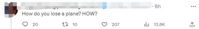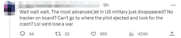 圖自社交媒體截圖 還有網友質疑,美國最先進的戰機竟然會失蹤,難道沒有任何追蹤設備嗎?該網友還表示,軍方人員為什麼不能去飛行員彈射附近區域搜尋殘骸?