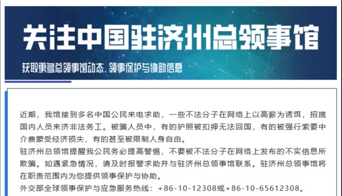 香港中通社9月28日電 近期,中國駐濟州總領事館接到多名中國公民來電求助,一些不法分子在網絡上以高薪為誘餌,招攬國內人員前往濟州非法務工。據報道,這反映了韓國的電信詐騙有趨向嚴重的跡象。