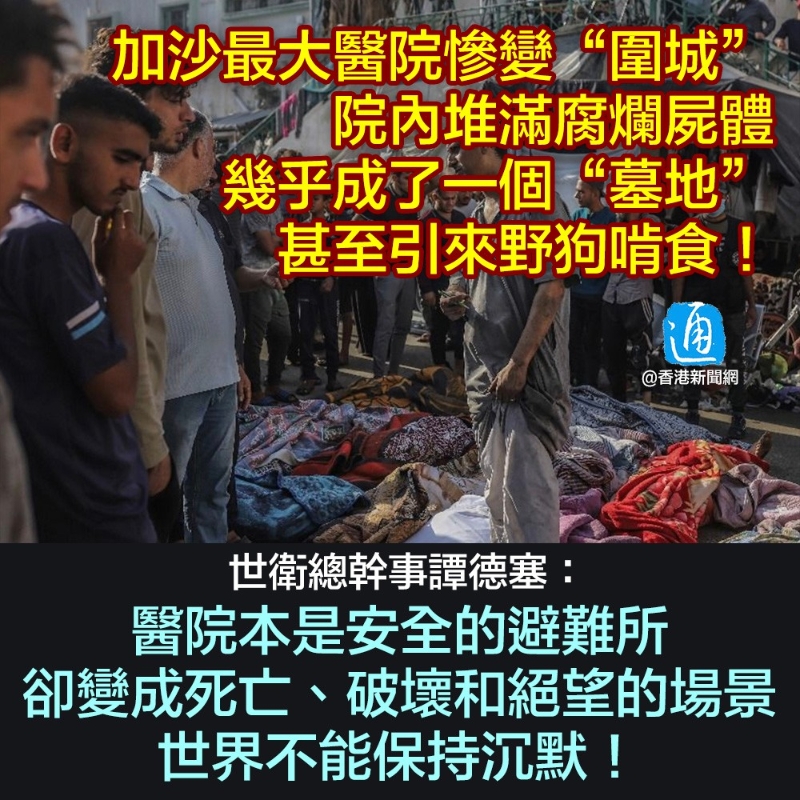 以色列軍方稱,希法醫院本身沒有槍擊事件也沒有被圍困,任何想要離開的人都可以離開。哈馬斯管理的衛生部則稱,醫院內至少還有2300人,其中患者多達650名,另有200至500名工作人員,以及約1500名尋求庇護的人。 世界衛生組織發言人林德邁爾(Christian Lindmeier)表示,有約600人留院,其餘人則躲在醫院各迴廊。他這樣形容醫院內的慘狀:“醫院到處都是遺體,既無法處理也無法下葬或送至任何形式的太平間。院內已無法再像醫院該有的樣子運作,它幾乎成了一個墓地。” 希法醫院經理塞爾米亞(Mohamed Abu Selmia)表示,院內屍體堆積如山,有150具已開始腐爛,留下了難聞的氣味。他同時指出,以色列當局尚未批准把死者移出醫院進行埋葬,導致許多野狗進入醫院並開始啃食遺體。 世衛此前警告,希法醫院面臨斷電和燃料短缺的問題。塞爾米亞說,由於希法醫院已處於停電狀態,當地數十名早產兒無法再繼續待在保溫箱內,其中7名嬰兒因缺氧而不幸身亡。塞爾米亞稱,已與以色列當局進行談判,試圖撤離嬰兒,但尚未達成協議。 不僅加沙北部狀況慘烈,加沙南部亦未能倖免。據BBC、法新社等報道,加沙南部汗尤尼斯經歷以軍通宵襲擊,當地納賽爾醫院(Nasser Hostpial)接收多名病人,有兒童渾身血跡。 加沙慘況愈演愈烈,美國總統拜登當地時間11月13日表態稱,“希望看到對醫院侵入性行為的減少”,強調“醫院必須受到保護”。以色列國防軍(IDF)同日指責哈馬斯在希法醫院下方的地道建立指揮中心,哈馬斯和院方則予以否認。 世衛總幹事譚德塞在社交媒體上發文呼籲“現在就停火!”他表示,“當醫院本應是安全的避難所,卻變成了死亡、破壞和絕望的場景時,世界不能保持沉默!” 【編輯:張琦】