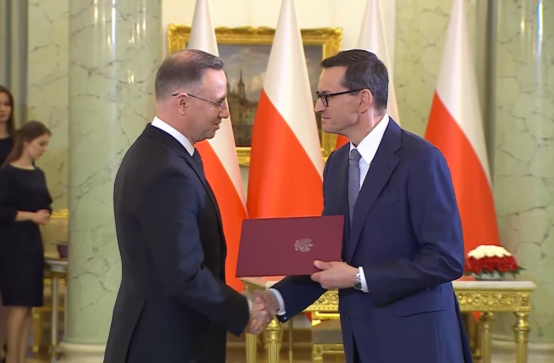 波蘭總統杜達(左)與波蘭總理莫拉維茨基在宣誓就職儀式上握手。視頻截圖 據波通社報道,莫拉維茨基當天下午向總統杜達提交了新政府成員名單,其中希蒙·申科夫斯基·韋爾森克任外交部長,馬里烏什·布瓦什恰克留任國防部長。在新政府中,超過半數成員為女性。 新政府須在14天內接受議會眾議院信任投票,如未能通過信任投票,眾議院將選舉新總理負責組閣。 分析指出,來自法律與公正党的莫拉維茨基及其領導的政府難以在眾議院獲得多數支持,總共獲得248個眾議院席位的公民聯盟、“第三條道路”聯盟和新左翼黨將很可能組成聯盟上台執政,曾擔任歐洲理事會主席的前總理圖斯克預計將出任總理。 波蘭眾議院共有460個席位,參議院有100個議席。在10月15日舉行的波蘭議會選舉中,法律與公正黨繼續保持議會眾議院第一大黨地位,但只獲得眾議院的194席,未能超過半數席位,失去獨立執政資格。杜達11月初宣布,根據議會傳統,贏得議會選舉的政黨首先獲得組閣機會,他決定將組閣任務交給莫拉維茨基。(完) 【編輯:梅婉潼】