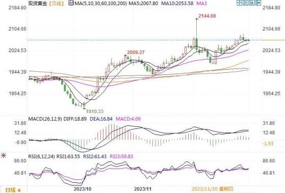 上周,受美元走軟提振,現貨黃金連續第三周上昇,金價收報2062.74美元/盎司,周線上昇0.5%。上周盤中,現貨黃金最高觸及2088.43美元/盎司。上周推動黃金的走勢表現,主要是非常激進的降息預期推動了貴金屬漲勢。市場定價美聯儲將於3月降息,且2024年總共降息150個基點。 繼2023年出人意料的強勁表現後,目前有機構預計2024年金價將進一步上漲,這將由三大驅動因素推動:追逐動能的對衝基金、央行持續穩定購買實物黃金,以及交易所交易基金(ETF)投資者的重新湧入。進入新的一年裡,全球央行的主題似乎是更低的利率即將到來,這將成為推動黃金走升的主線。而美元和收益率下降將直接為黃金的走升鋪平道路。除了上述原因外,市場還有另一個因素,那就是以色列與加沙之間的衝突擴大。地緣政治風險的持續存在、以及央行的購買黃金行動,都將支撐黃金市場。 技術層面上,日K線圖上,金價保持在布林帶中軌線遠上方,顯示黃金多頭尚能保持著優勢。下方的支撐位置依次在2050和2035,不跌穿2050-2035的位置,就不會形成暴跌態勢。4小時圖上,技術指標暫時鈍化,暗示多空都不會很強勢和明顯,布林帶下軌道支撐位置上移到2055附近的位置,中軸壓力位置2071附近,上軌道位置2085附近。綜合起來看,在厘清新一年主要影響路徑之前,本周黃金預料將暫時陷入窄幅區間交易模式,方向突破性機會不會太大。 (完) (聲明:本文內容僅供參考,不構成投資建議。) 【編輯:錢林霞】