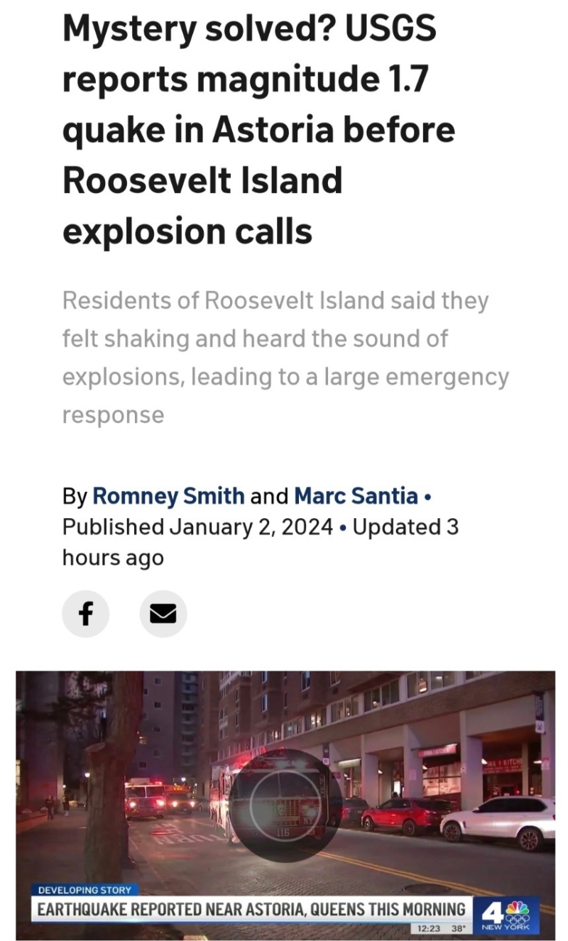 香港新聞網1月3日電 綜合美國全國廣播公司(NBC)、《紐約每日新聞》等美媒報道,當地時間2日,紐約皇后區發生1.7級地震,幾乎在同一時間,羅斯福島發生了一系列爆炸。 據NBC報道,2日清晨6時左右,應急人員接到羅斯福島居民的報警電話,稱他們感到搖晃,并聽到主街地區傳來輕微爆炸聲。 紐約消防局的工作人員作出回應,并搜索了該地區,包括幾座建築物,但沒有發現火災或報告的可能來源,隨後派出緊急救援人員尋找爆炸的可能來源。