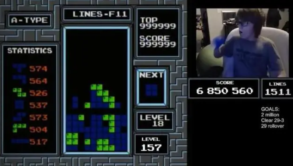 吉布森勝出一刻 (網絡視頻截圖) 據英國《每日郵報》當地時間1月2日報道,家住俄克拉何馬州的威利斯·吉布森去年12月在線直播玩《俄羅斯方塊》。直播畫面顯示,他只用幾分鐘便打到“普通人天花板”的第30關,獲得999999分。接著,方塊掉落速度越來越快,但吉布森憑借驚人的反應能力,最終用大約38分鐘玩到第157關,令遊戲畫面定格,代表遊戲端“徹底沒轍了”。 此時,吉布森一臉不可置信地說:“天啊!我要暈倒了!我感覺不到手在哪裡。” 吉布森11歲開始玩《俄羅斯方塊》,每天要玩3到5個小時。他成為專業玩家,多次在比賽中獲獎。本次大獲全勝之前,他數次向徹底擊敗遊戲端發起衝擊,總是功虧一簣。他坦言,最大困難是30分鐘後自己會變得緊張。 《俄羅斯方塊》遊戲1984年問世,曾經風靡全球,被認為是史上最受歡迎的遊戲之一。(完) 【編輯:葉永成】
