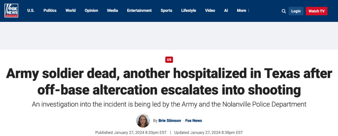 福克斯新聞網報道截圖 報道稱,這兩名士兵隸屬於駐扎在該基地的美國陸軍第三軍第一騎兵師,具體身份尚未披露,當局也沒有提供槍擊案的其他任何細節,包括二人爭吵的內容。 美國陸軍中校查爾斯·帕特森(Charles Patterson)27日晚對福克斯新聞表示,受傷士兵的狀況穩定,美國陸軍和諾蘭維爾當地警方正在就槍擊事件進行調查,事發後基地對士兵家屬給予了幫助。 諾蘭維爾警方同日證實正與軍方合作開展調查。警方還稱,事件發生在27日上午9點左右,倆人發生口角後互相開槍,有關該事件的進一步信息將在晚些時候公佈。
