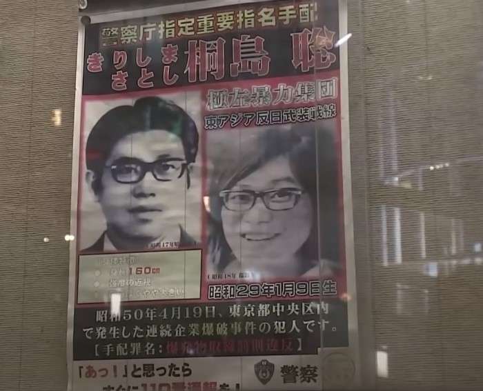 桐島聰的通緝令。視頻截圖 綜合日媒報道,今年初,該男子因患有晚期胃癌在神奈川縣鐮倉市的一家醫院住院,起初一直使用假名字,直到本月25日才告知醫護人員他叫桐島聰。這名自稱為桐島聰的男子生前表示,自知時日無多,希望在最後時刻使用真名,所以自行揭發自己就是通緝犯。 東京警視廳通過神奈川縣警方獲悉這一消息。目前,警視廳正在抓緊通過DNA檢測等方法確認其身份,並調查該男子聲稱曾匿藏的地點。 桐島聰是日本在逃時間最長的通緝犯,屬於極左組織“東亞反日武裝戰線”成員,組織主張反帝國主義和反殖民主義,在1970年代發動多宗針對企業的爆炸案,警方先後拘捕一批組織成員,桐島聰於1975年5月被通緝。(完) 【編輯:梅婉潼】