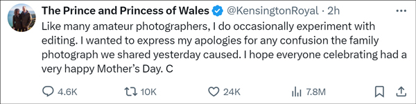 威廉與凱特的官方社交賬號截圖 3月10日,王儲威廉與凱特的社交媒體X賬號分享了一張凱特和3個孩子的合影,這張照片據稱由威廉拍攝。美聯社、路透社等媒體在報道中使用該照片後決定將其撤回,原因是認為照片疑似“被編輯”。凱特此前接受了“腹部手術”,這是凱特在接受手術後的第一張官方照片。 照片中,42歲的凱特坐在藤編的椅子上衝著鏡頭微笑,看起來身體恢復得非常好。三個孩子(喬治王子、夏洛特公主和路易王子)圍繞在她的身邊,以展現溫馨美好的氛圍。 “感謝你們過去兩個月來的善意祝福和一如既往的支持。祝大家母親節快樂。”照片配文道。