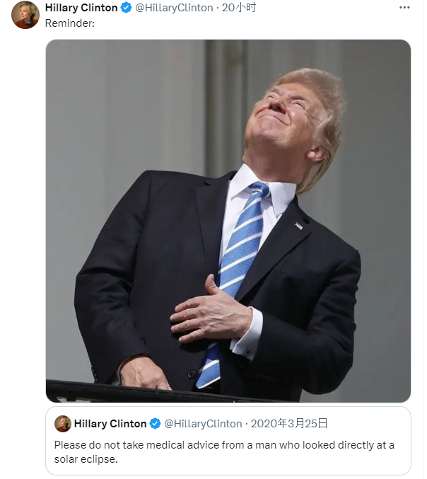 圖源網絡 拜登這一表態被指疑似挖苦他的競爭對手特朗普。畢竟,2017年時任美國總統特朗普也曾在白宮的陽台上觀賞日全食景象,但他當時一度摘下防護鏡,抬頭看向太陽。 美國前國務卿希拉里8日也轉發多年前的帖文,並配上特朗普看向天空的圖片,頗有挖苦的意味。