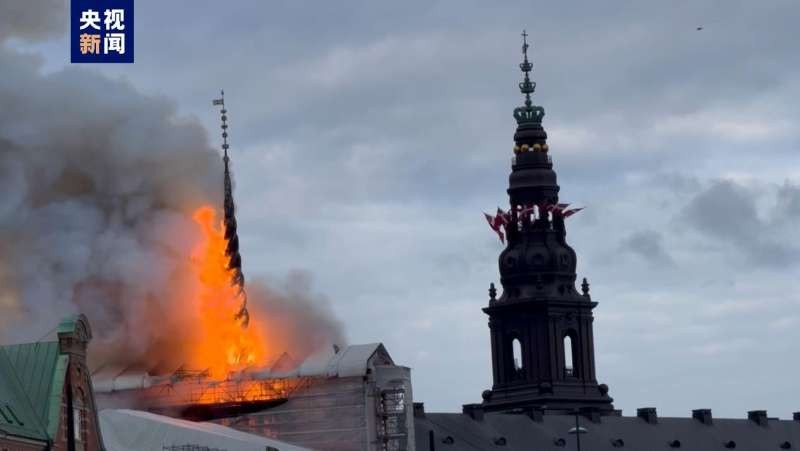 4月16日,丹麥哥本哈根證券交易所發生火災,標誌性的尖頂已經墜入火海。圖自央視新聞
