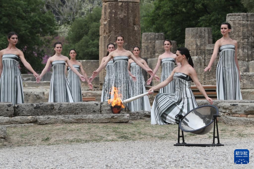4月16日,扮演最高女祭司的演員瑪麗·米娜取得聖火。新華社圖片 由於天氣原因,火種採集未使用凹面鏡,而是用前一日採集的備用火種點燃火炬。今年奧運火種採集儀式更新了服飾與音樂,女祭司們的服裝造型改為黑白雙色。第一棒火炬手為希臘運動員、東京奧運會男子賽艇項目金牌得主斯特凡諾斯·恩圖斯科斯。 按照日程安排,奧運火炬將在希臘境內進行為期9天的傳遞,於4月26日在雅典交接給巴黎奧組委,4月27日離開希臘前往法國,5月8日抵達法國馬賽。 奧林匹克運動會發源於兩千多年前的古希臘,因舉辦地在奧林匹亞而得名。從1936年柏林奧運會開始,每屆奧運會開幕前幾個月,都會在希臘奧林匹亞遺址舉行奧運會火種採集儀式,將古老的奧運精神與現代文明緊密相連。 2024年巴黎奧運會將於7月26日開幕,4月17日也是巴黎奧運會開幕倒計時100天的日子。(完) 【編輯:馬華】