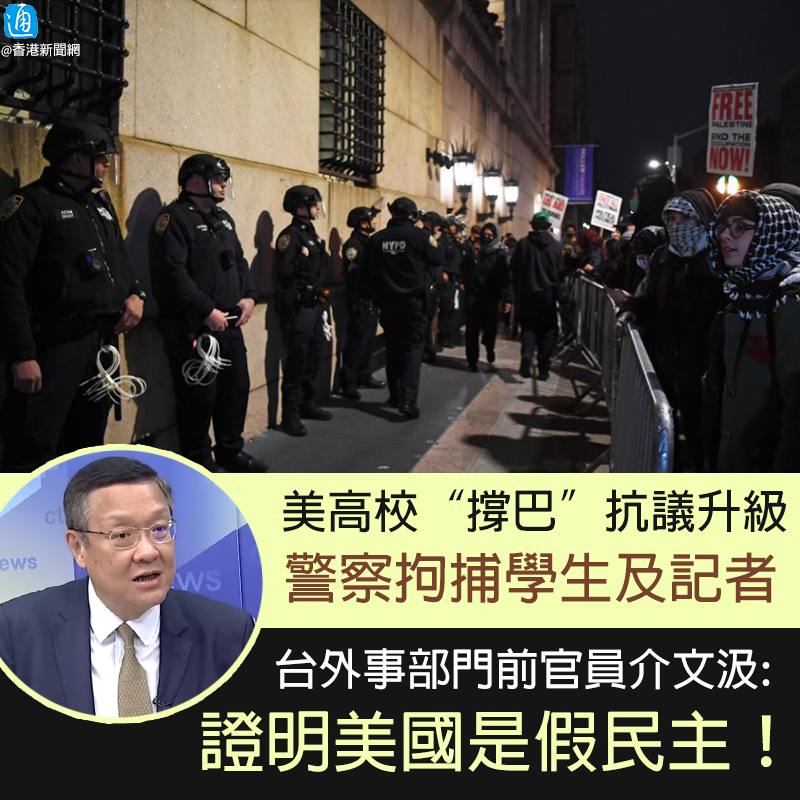 香港新聞網4月26日電 美國各地大學聲援巴勒斯坦的抗議活動愈演愈烈,蔓延至全國數十間大學,警方多次進入校園,與抗議者爆發衝突,大批學生及至少一名記者被捕。對此,台外事部門前官員介文汲表示,和平抗議的學生被捕證明美國是“假民主”。 紐約州哥倫比亞大學的抗議活動持續約一個星期,幾百名學生露宿校園,警方在校園大門外監視。得克薩斯大學奧斯汀分校近日則發生暴力衝突,至少20人被捕,包括一名霍士新聞台攝影記者。現場畫面顯示,學生們手持抗議標語高呼口號走出課室,數名騎警與手持警棍的警察排成一排,將抗議者推倒在草坪上,被捕記者被警察打倒在地。得州州長阿博特揚言,所有抗議者都應被送入監獄。 對於美國警方暴力對待和平抗議的學生,台外事部門前官員介文汲直言這是“美國民主的崩潰”!他指,美國自詡“百分百言論自由”,只要不發生暴力行為,都可以自由表達意見,這是美國民族的特徵之一。但這次,美國學生聲援巴勒斯坦的抗議活動只是在校園中和平舉行,持不同意見的學生分坐不同陣營,沒有發生暴力衝突,也沒有在校園中造成任何破壞,軍隊居然就拿著棒子、盾牌把人壓到地上,把學生抓走,“證明美國是假民主!”