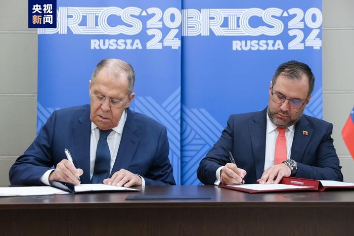 6月11日,俄羅斯外長拉夫羅夫與委內瑞拉外長希爾共同簽署諒解備忘錄。圖自央視新聞 希爾當天表示,在“金磚+”合作框架內簽署這一備忘錄,將推動兩國成立不受外部干涉的相關金融合作機制,以及強化雙邊在農業、醫藥、能源、先進技術等領域的合作。 同日,希爾在與拉夫羅夫會晤時表示,委內瑞拉計劃今年加入金磚國家聯盟。 金磚國家同發展中國家外長對話會(“金磚+”)在俄羅斯下諾夫哥羅德舉行。金磚10國同泰國、老撾、越南、白俄羅斯、土耳其、古巴、委內瑞拉等12個具有區域代表性的重要發展中國家進行交流。(完) 【編輯:梅婉潼】
