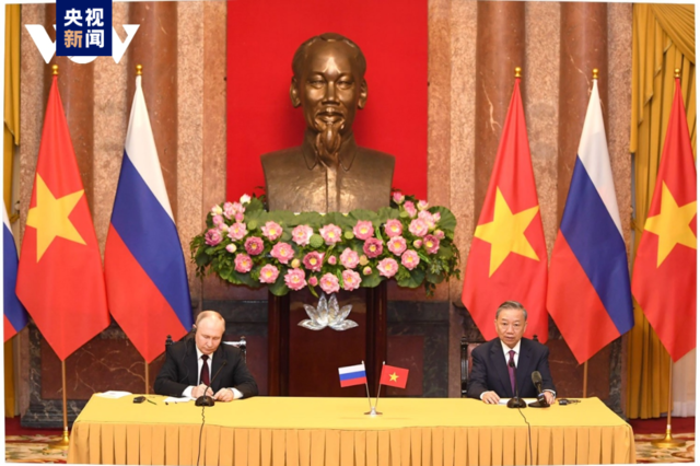 央視新聞圖片 聲明顯示,雙方同意在互信、平等互利、互不干涉內政的基礎上,根據《聯合國憲章》和國際法的基本原則,加強關係,不與第三方結盟或達成協議,不採取有損於彼此獨立、主權、領土完整和根本利益的行動,不反對任何第三方,支持並繼續為地區和世界和平做出貢獻。 雙方同意有效落實、盡快談判和加強越南與歐亞經濟聯盟之間的自由貿易協定,促進雙邊貿易和投資。 此外,雙方同意盡快研究和擴大新能源、清潔能源、綠色轉型和可持續發展領域的研究合作。雙方願在國際法和國際慣例的基礎上,促進防務與安全合作。 當地時間6月20日凌晨,普京抵達越南首都河內,開始對越南進行國事訪問。這是普京第5次以國家元首身份訪問越南。 20日中午,越南國家主席蘇林在主席府用最高規格的國家禮儀歡迎普京到訪。 歡迎儀式結束後,兩國領導人舉行了會談,評價兩國近期的合作成果,並提出未來的合作方向。(完) 【編輯:馬華】