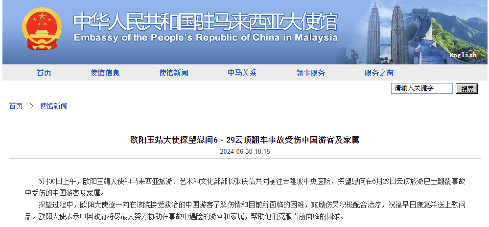 中國駐馬來西亞大使館官網截圖 30日上午,中國駐馬大使歐陽玉靖和馬旅遊、藝術和文化部部長張慶信共同前往吉隆坡中央醫院,探望慰問事故中受傷的中國遊客及家屬。 探望過程中,歐陽玉靖表示,中國政府將盡最大努力協助在事故中遇險的遊客和家屬,幫助他們克服當前面臨的困難。歐陽玉靖隨後在醫院接受中外媒體採訪,表示巴士翻覆事故發生後,中國政府高度重視和關注,中國駐馬使館第一時間啟動應急機制,派員了解核實現場情況,協調馬旅遊主管部門、警方、醫療機構及有關旅遊行業組織及時組織力量開展應急處置、事故調查、傷員救治及善後安置等工作,敦促馬政府進一步加強旅遊從業人員監督管理,切實保障中國遊客的安全和合法權益。 張慶信部長代表馬政府對此次事故的發生深表哀悼和歉意,表示馬政府對此高度重視,其將親自召集馬交通、陸路交通局等相關部門召開專門會議,共同研究事故原因及改進措施。與此同時,馬旅遊、藝術和文化部也將對涉事旅行社啟動調查程序,並盡力協助中國傷亡遊客及家屬做好救治及善後工作。(完) 【編輯:林曉惠】