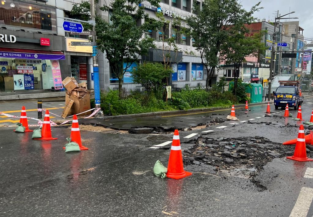 2022年8月9日在韓國首爾拍攝的因遭遇強降雨而受損的道路 新華社資料圖片 據韓國氣象廳30日消息,截至當天10時,京畿道、仁川市、忠清南道、全羅北道、全羅南道、慶尚北道、慶尚南道、釜山市、濟州道等全國大部分地區發布強風預警。 發布暴雨預警的濟州山區以及全羅道、慶尚道地區出現強降雨天氣,每小時降雨量達10到30毫米。當天凌晨3時49分許,在大田市西區葛馬洞一條公路附近,強風大雨致行道樹倒伏,砸到了停在路邊的汽車,所幸沒有造成人員傷亡。同一時段,江原道春川市某公寓施工現場因大雨而發生泥石流,居住在附近的4名居民避險。 受惡劣天氣影響,多個航班和客輪航線停航,主要旅遊景點限制通行。截至當天上午10時,濟州國際機場18架次國內線航班被取消,13架次國內和國際線航班延誤。連接仁川和西部海域島嶼的14條客輪航線中的12條14個班次停航。 受全國各地強風天氣影響,停電事故也接連不斷。前一天18時20分許,在仁川市桂陽區,樹木被大風吹倒,壓住電線,造成110戶家庭斷電。當天7時37分許,在慶尚南道昌原市,樹木被吹到,壓住電線致992戶家庭停電,3小時40多分鐘後才恢復供電。(完) 【編輯:林曉惠】