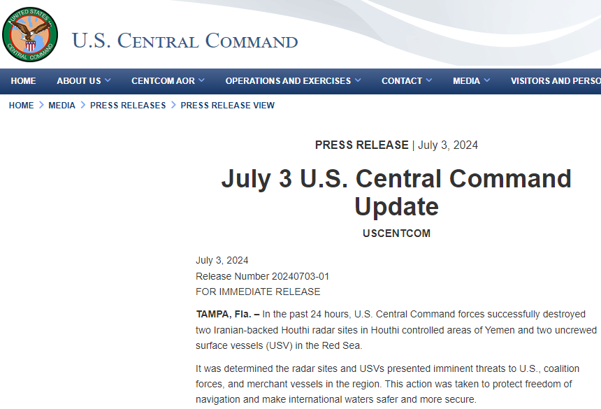 美國中央司令部官方網站截圖 聲明稱,這些雷達站和無人水面艦艇對該地區的美軍、聯軍和商船構成了“迫在眉睫的威脅”。美軍採取這些行動是為了保護航行自由,使美國、盟軍和商船在國際水域更加安全。 去年10月新一輪以哈衝突爆發後,胡塞武裝開始在紅海水域襲擊“與以色列有關聯”的船隻,以示“對巴勒斯坦的支持”。今年1月12日以來,美國和英國連續對胡塞武裝目標發動空襲,造成多人死傷。 另一方面,也門胡塞武裝發言人薩雷亞2日晚發表講話稱,胡塞武裝同伊拉克民兵武裝“伊斯蘭抵抗組織”合作,對以色列海法的重要目標採取了聯合軍事行動,使用導彈襲擊了目標。 薩雷亞還表示,胡塞武裝將繼續同伊拉克“伊斯蘭抵抗組織”合作,展開相關軍事行動,支持巴勒斯坦民眾,直到針對巴勒斯坦的衝突行動停止、封鎖解除,否則胡塞武裝不會停止相關軍事行動。(完) 【編輯:林曉惠】