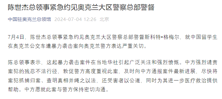香港中通社7月4日電 據中國駐奧克蘭總領館微信公眾號消息,7月4日,駐奧克蘭總領事陳世傑緊急約見奧克蘭大區警察總部警督斯科特·格梅爾,就中國留學生在奧克蘭公交車遭暴力襲擊案向奧克蘭警方表達嚴重關切。