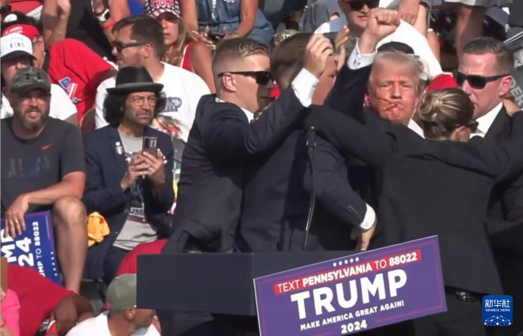 這張視頻截圖顯示,7月13日,美國前總統特朗普在賓夕法尼亞州巴特勒市的競選集會現場被護送離開。新華社發 78歲的特朗普13日在搖擺州賓夕法尼亞州出席競選集會時遭槍擊,右耳受傷。這起事件造成一名參與集會的50歲男子死亡,另有兩人重傷。20歲槍手被特勤局狙擊手擊斃。 特朗普遇襲擊後在社媒平台說,他“靠上帝”撿回一命,梅拉尼婭14日在X平台譴責行兇者是“野蠻禽獸”。她說:“當我看到那顆子彈擊中我丈夫時,我意識到我和巴倫的生活正處在毀滅性變化的邊緣。”巴倫是特朗普和梅拉尼婭的18歲兒子。 梅拉尼婭也向冒著生命危險保護特朗普的特工和執法人員表示感謝。 在特朗普險些暗殺後,美國總統拜登表示已與特朗普進行了“簡短但友好的通話”,他“對特朗普狀態不錯感到欣慰”。他說,他已指示美國特勤局審查即將在威斯康星州密爾沃基市舉行的共和黨全國代表大會的所有安保措施。隨後拜登在橢圓形辦公室發表了不到7分鐘的正式講話,呼籲全國人民為政治氣氛降溫,“冷靜下來”,並謹記彼此是左右鄰居。(完) 【編輯:馬華】