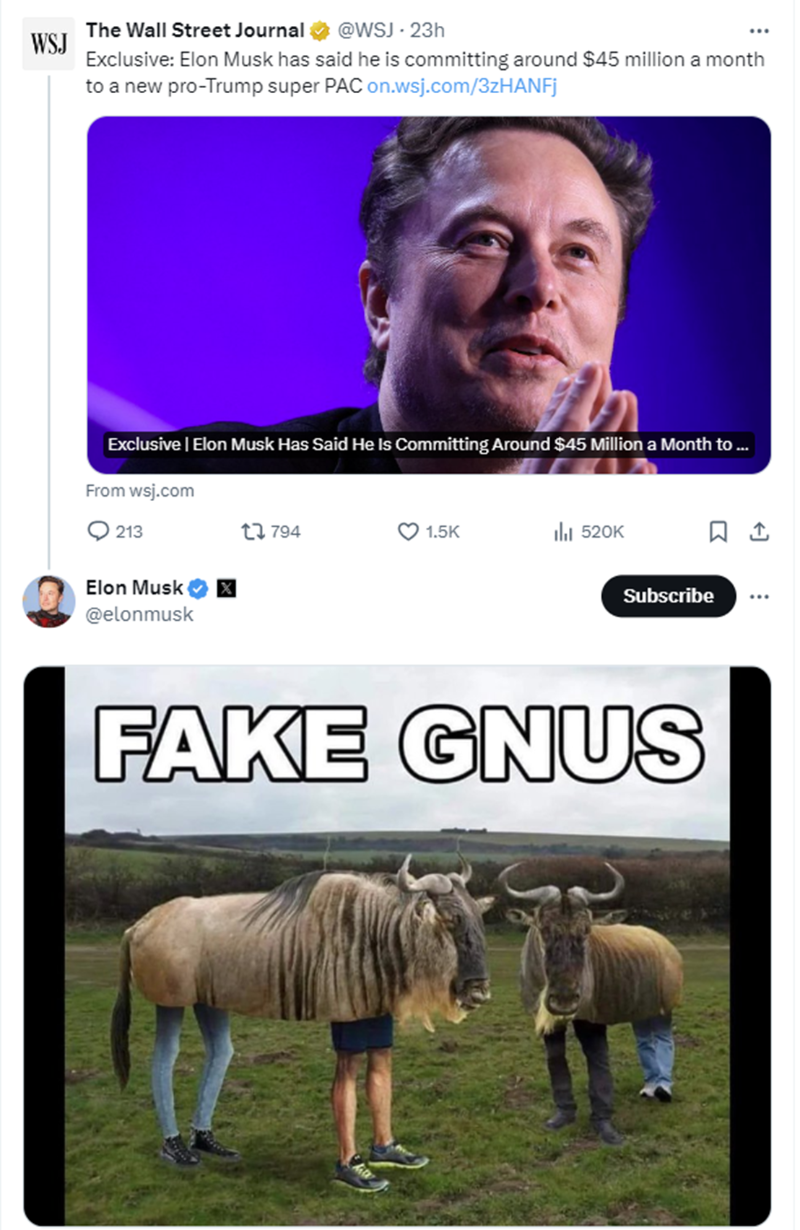 香港新聞網7月17日電 對於美國《華爾街日報》關於“美國企業家埃隆·馬斯克計劃每月向為美國前總統特朗普助選組織捐款約4500萬美元”的報道,馬斯克16日作出回應。 據環球網報道,天空新聞網提到,《華爾街日報》16日報道稱,有知情人士透露,馬斯克表示,他計劃每月向一個支持特朗普競選總統的政治行動委員會捐款大約4500萬美元,以助力特朗普入主白宮。《華爾街日報》還稱,該委員會名為“美國政治行動委員會”。 《華爾街日報》16日還在社交平台X上分享了這篇報道的鏈接,馬斯克後來在評論區發了一張圖,上面的配文是“假牛羚”。對此,天空新聞網稱,馬斯克“似乎否認了”《華爾街日報》上述報道。
