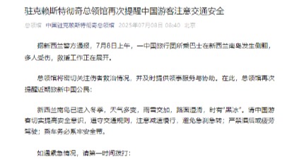 現場視頻截圖 中國駐克賴斯特徹奇總領館官方公眾號消息,根據新西蘭警方通報,兩輛載有中國遊客的大巴18日上午在南島翻側,2人重傷,已送往醫院,無生命危險。 總領館說,已第一時間啟動應急機制,領事人員已趕赴醫院看望傷者,並已要求相關旅行社妥善安置其他中國遊客。 總領館再次提醒近期前往新西蘭南島的中國公民,南島冬季天氣多變,雨霧交加,路面濕滑,時有“黑冰”,務必提高安全意識,注意交通安全。(完) 【編輯:林曉惠】