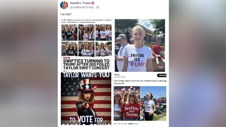 香港新聞網8月20日電 美國共和黨總統候選人特朗普早前引用一張疑似使用歌手泰勒·斯威夫特(Taylor Swift)肖像生成的人工智能(AI)圖像,及數張歌迷的相片,暗示獲Taylor Swift和歌迷支持競選總統。 事件引起Taylor Swift的歌迷不滿,當地時間19日,他們批評特朗普散播假消息。Taylor Swift則暫時未有回應。 特朗普日前在社交平台上發放帖文,展示一系列相片,其中一張圖片採用Taylor Swift的肖像,附有“Taylor Swift希望你投票給特朗普”的標語,亦有相片顯示Taylor Swift的歌迷穿上寫有“支持特朗普”字句的上衣。特朗普在帖文附上“我接受”的字句。