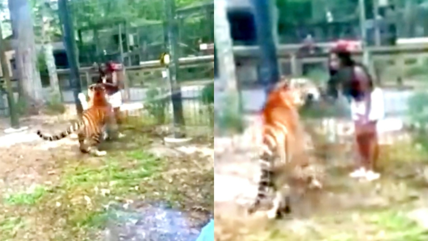 香港新聞網8月23日電 美國新澤西州的可漢席克動物園(Cohanzick Zoo)近日發生一起驚險事件。一名女子疑似為了挑釁園內的孟加拉虎,竟冒險翻越圍欄,伸手逗弄老虎,將自己置於危險之中。