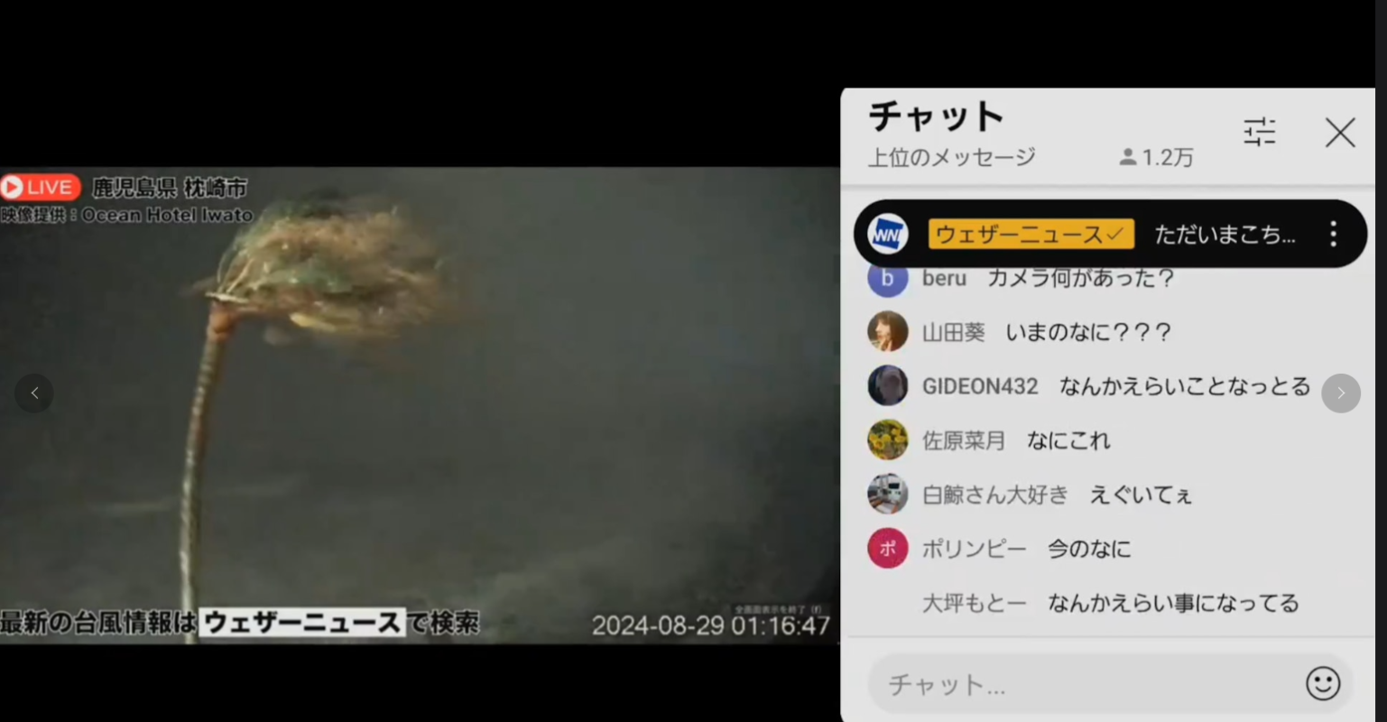 上萬網友深夜觀看直播為椰樹君集氣。視頻截圖。 鹿兒島縣枕崎市酒店Ocean Hotel Iwato,在海邊設置了即時影像監視器,畫面左側可以看到一棵椰子樹,後方則是沙灘與大海。 每逢颱風襲擊時,大批網友就會打開直播,為這棵被稱為“椰樹君”的椰子樹加油打氣。“椰樹君”至今已至少挺過4次颱風摧殘。 “珊珊”28日接近九州後,《朝日電視台》、《Weather News》等都在YouTube頻道分享Ocean Hotel Iwato的直播影片,吸引上萬網友確認“椰樹君”的狀況。 28日深夜11點46分,狂風暴雨使”椰樹君“被吹得歪七扭八、數度出現殘影,讓許多網友憂心表示“椰樹君好像會被連根拔起”、“等我明天起床,它會不會就消失了?”,急忙幫它集氣。