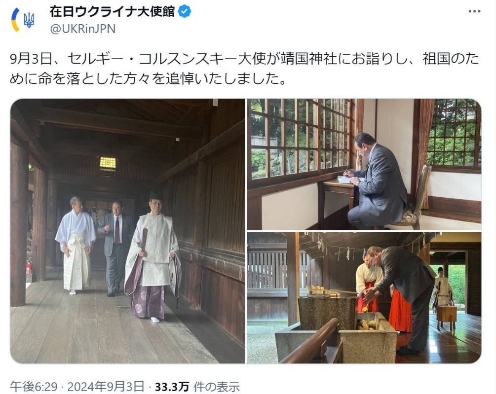 香港新聞網9月4日電 9月3日是中國人民抗日戰爭暨世界反法西斯戰爭勝利79周年紀念日。然而在這一天,烏克蘭駐日本大使館竟曬出大使科森斯基當天參拜靖國神社的照片,還聲稱此舉是“瞻仰為國捐軀的烈士”。 此事隨後引起曾飽受日本侵略之苦的中韓等國的強烈憤慨。