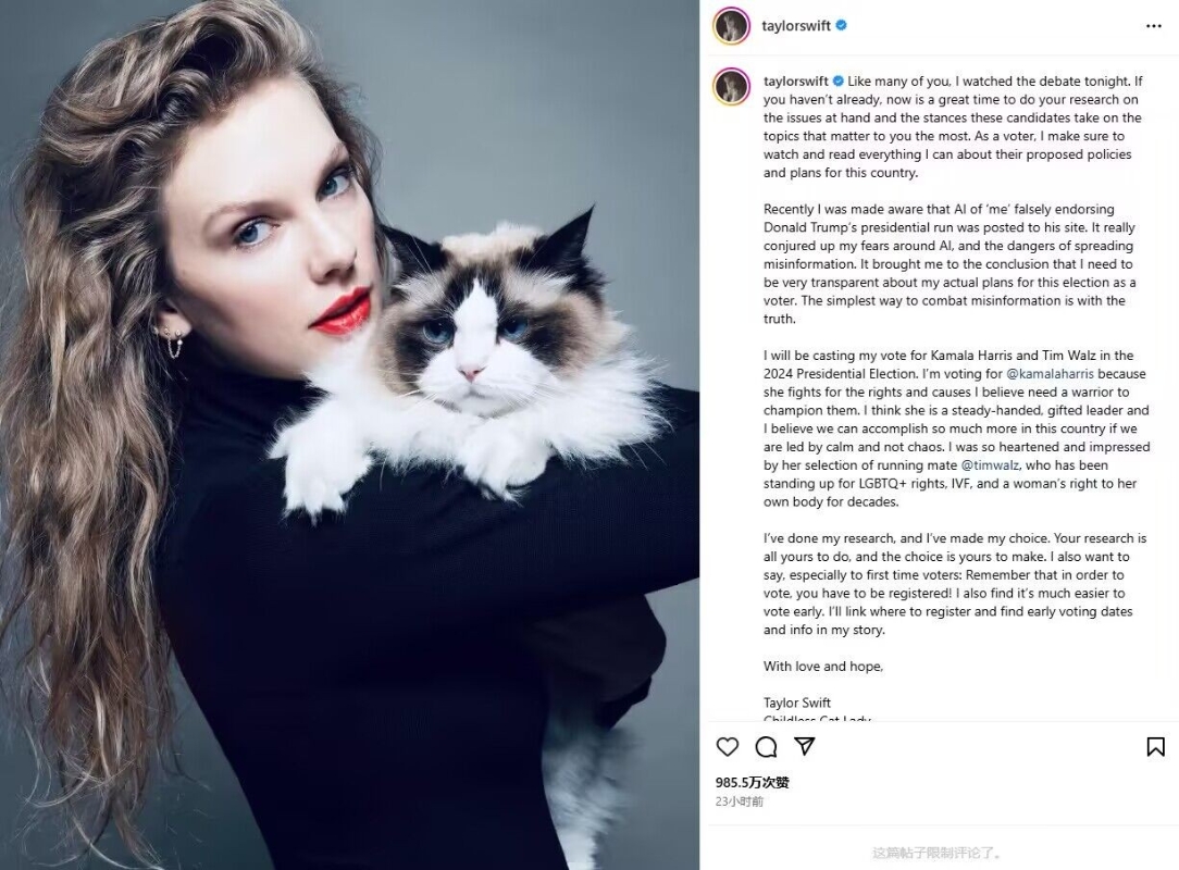 Taylor Swift社交媒體Instagram截圖 在社交媒體Instagram擁有超過2.8億“粉絲”的Taylor Swift發帖文表示,將於11月5日的總統選舉中投票給哈里斯,又指自己和很多人一樣觀看了電視辯論,是時候研究總統候選人對大家最關心議題的立場。 有政治學者分析,Taylor swift早於上屆大選已支持當年的民主黨總統候選人拜登及副手哈里斯,大家早知她的政治取態,加上她的“粉絲”主要是年輕人及女性,但這兩個群組本身也是哈里斯的”基本盤“,所以Taylor swift這次表態支持,對哈里斯的選情影響不會太大,但可能會對選民登記產生影響。 此外,哈里斯與特朗普的首場辯論的視頻,經過剪輯的辯論短片也在社交媒體平台上展開第二場較量,捕捉了辯論中的一些令人印象深刻的瞬間。 《紐約時報》引述政治戰略師表示,社交媒體在今年總統選舉發揮的作用比過去更為顯著。民主黨和共和黨都招募了內容創作者或網紅來傳播總統候選人的政策和候選人信息。 總體而言,從粉絲數量來看,特朗普在X和TikTok的表現勝過哈里斯。哈里斯競選總部賬戶在X有130萬粉絲,特朗普有240萬粉絲。然而哈里斯競選團隊在TikTok的視頻獲得超過1億個贊,而特朗普只有4400萬個贊。(完) 【編輯:林曉惠】