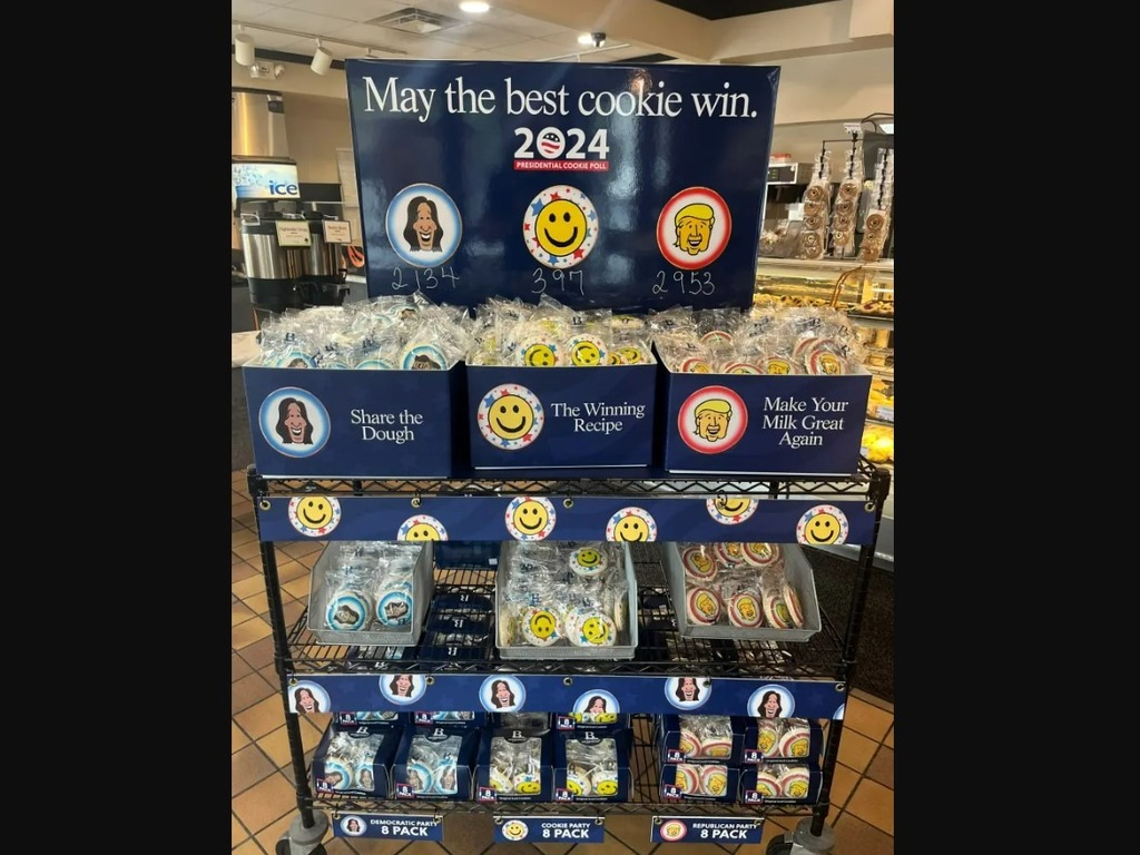 “餅乾民調”顯示特朗普大幅領先。網上圖片 博斯肯麵包店(Busken Bakery)自1984年起舉辦“餅乾民調”,雖然計算簡單但幾乎精準預測每屆大選結果,唯獨在2020年拜登對決特朗普的大選中誤判。當時特朗普雖然拿下俄亥俄州,卻輸掉選舉。 根據這項餅乾民調,截至當日特朗普餅乾賣出2953塊,哈里斯餅乾賣出2134塊,特朗普以相當於54%支持度領先哈里斯15個百分點,另外畫有笑臉代表“獨立”則佔7%。這項民調將持續統計至11月5日投票日為止。