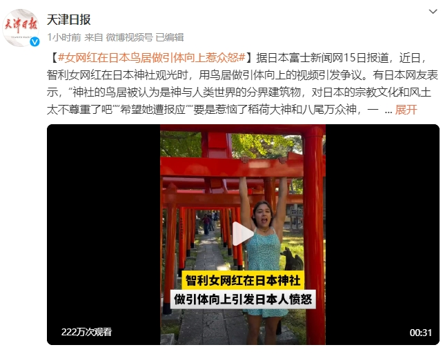 (圖:天津日報微博截圖) 有日本網友表示,“神社的鳥居被認為是神與人類世界的分界建築物,對日本的宗教文化和風土太不尊重了吧”“希望她遭報應”“要是惹惱了稻荷大神和八尾萬眾神,一定會降禍的”“會被狐狸附身遭到天譴”。 報道稱,智利當地也有媒體以“對在日本鳥居上做懸垂的智利女性感到憤怒”為標題進行了報道,引起了熱議。 目前該網紅已經將這段視頻删除,並在社交媒體上道歉。(完) 【編輯:李彥洲】