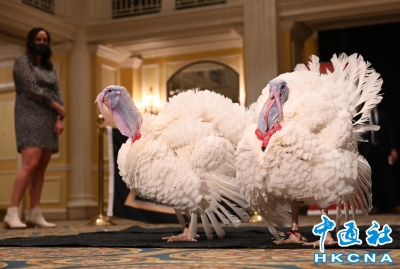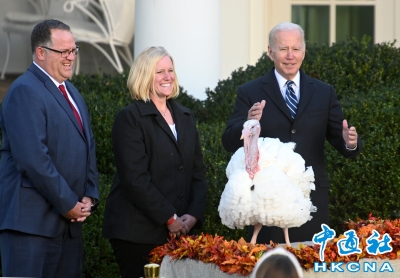 香港新聞網11月26日電 當地時間25日,在2024年美國感恩節(11月第四個星期四)來臨之際,美國總統拜登在白宮延續節日傳統,“赦免”兩隻感恩節幸運火雞——“桃花”(Peach)和“朵朵”(Blossom)。