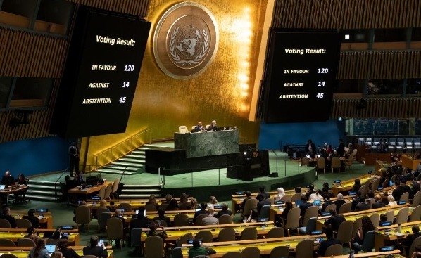 紐約聯合國總部 香港中通社資料圖片 其中,支持聯合國近東巴勒斯坦難民救濟和工程處履行任務的決議獲159票贊成,11票棄權,9票反對。要求在加沙停火的決議獲158票贊成,13票棄權,9票反對。 對兩項決議,中國均投贊成票;美國、以色列均投反對票。 中國常駐聯合國代表傅聰投票前發言說,加沙衝突延宕14個月,加沙被炸成廢墟,4萬多巴勒斯坦民眾被奪去生命,倖存者被剝奪最基本的生存物資,在絕望中掙扎。在這場空前的災難中,我們看到無差別的狂轟濫炸和對平民生命的漠視達到了駭人聽聞的程度,我們看到個別國家對盟友的縱容和袒護達到了毫無底線的程度,我們看到國際法的選擇性適用和雙重標準達到了前所未有的程度。 傅聰還強調,我們必須以最大的緊迫感重振“兩國方案”。實現巴勒斯坦和以色列兩個國家比鄰而居、共享安全和發展是實現巴以和平的唯一出路。國際社會應該為落實“兩國方案”加大支持、提供保障。中方支持巴勒斯坦國成為聯合國正式會員國。 11月20日,聯合國安理會就10個非常任理事國提出的加沙停火決議進行表決。由於美國一票否決,決議未能通過。安理會其他14國均投票贊成。(完) 【編輯:林曉惠】