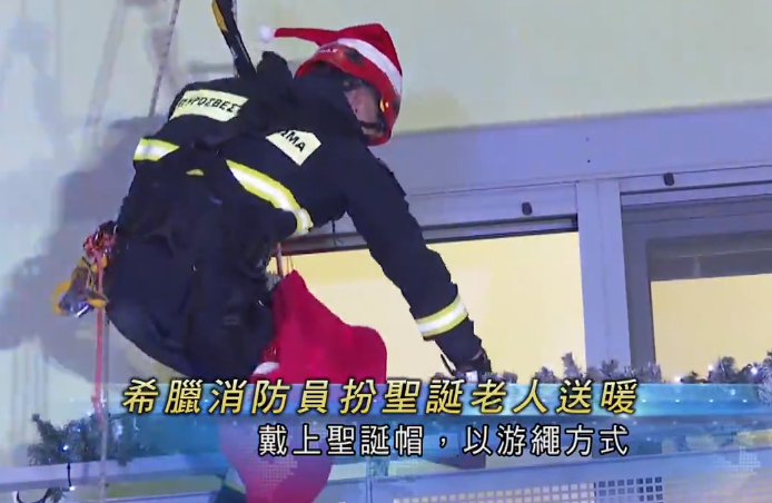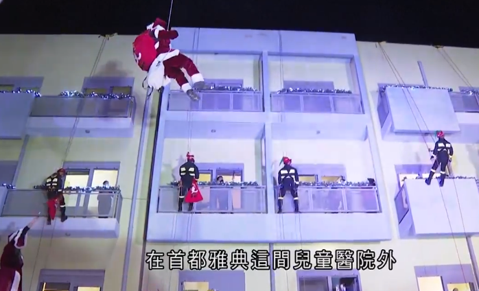 消防員為兒童醫院小童送暖。視頻截圖。 在首都雅典的一家兒童醫院外,12日晚上突然有多名消防員戴上聖誕帽,以游繩方式爬到不同樓層的露台,他們不是去救火救人,而是向病童及其家人派送禮物。當晚還有“聖誕老人”壓軸出場,引來不少院友和醫護到病房外圍觀。