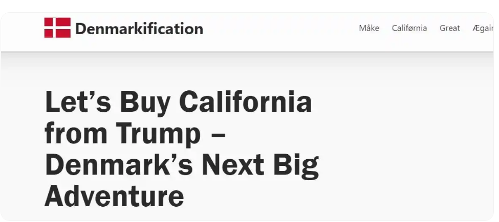 (網站截圖) 特朗普曾多次提出購買丹麥自治領土格陵蘭島的想法,理由是該島對美國具有重要的戰略和經濟價值。儘管丹麥和格陵蘭的官員都強烈反對這一想法。然而,特朗普表示,他將準備使用軍事和經濟力量來獲得這片領土。美國國務卿魯比奧上個月也強調,購買格陵蘭島是一個嚴肅的目標,“不是在開玩笑”。 在美國方面不斷釋放掌控格陵蘭的想法後,丹麥人選擇以牙還牙。 丹麥倡議人士小組Denmarkification近日提議,他們的國家可以花1萬億美元從美國購買加利福尼亞州,以回應特朗普收購格陵蘭島的計劃。 該網站已經收集到近20萬個簽名。該網站認為,對丹麥人來說,購買加州是一個不錯的選擇,因為那裡盛產牛油果,購買加州將帶來科技上的優勢,還能以丹麥童話作家安徒生的名字將迪士尼樂園重新命名為“漢斯·克里斯蒂安·安徒生樂園”。 該網站還宣布“讓加利福尼亞再次偉大”,以此內涵特朗普的流行語“讓美國再次偉大”。 該網站諷刺道:“特朗普並不是加州最大的支持者。他曾稱加州為‘美國最糟糕的州’,多年來一直與加州領導人不和。我們相信,只要價格合適,他一定願意放棄加州。”(完) 【編輯:李彥洲】
