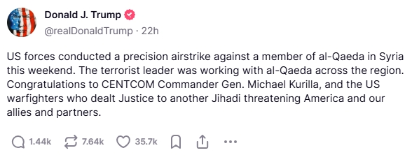 特朗普貼文截圖 特朗普在社交平台“真實社交”(Truth Social)上寫道:“美軍在周末於敘利亞對基地組織一名成員實施了精確打擊。這名恐怖分子頭目在整個地區與基地組織進行合作。” 特朗普還祝賀美軍中央司令部司令邁克爾∙庫里拉和美國軍人行動取得成功。 美國中央司令部當地時間周一在X平台上宣布,美軍周末在敘利亞西北部的一次精準空襲中,成功擊斃了一名基地組織下屬恐怖組織的高級成員,其擔任高級財務和後勤。 目前美國正在全球範圍內,打擊和削弱恐怖分子勢力。(完) 【編輯:淩玉輝】