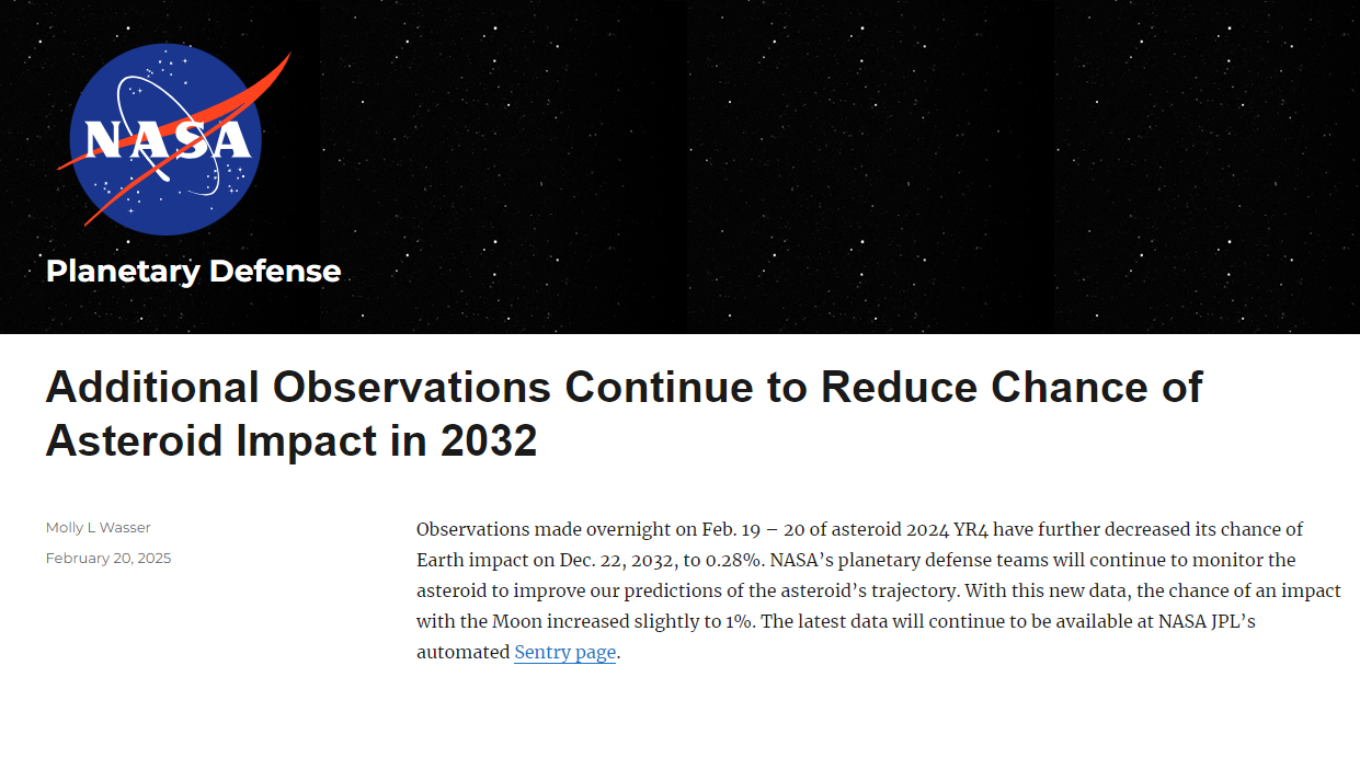 從3.1%到0.28%,小行星撞地球概率為何總變?香港新聞網2月21日電 美國國家航空航天局(NASA)18日將編號2024 YR4的小行星在2032年撞擊地球的概率調高到3.1%,使該小行星成為“有觀測以來撞擊地球概率最高的小行星”,但19日又將其概率下調至1.5%。而最新的觀測計算結果判斷,這顆小行星撞擊地球的可能性僅為0.28%,也就是大約360分之一,其“都靈指數”也從3級降為1級。
